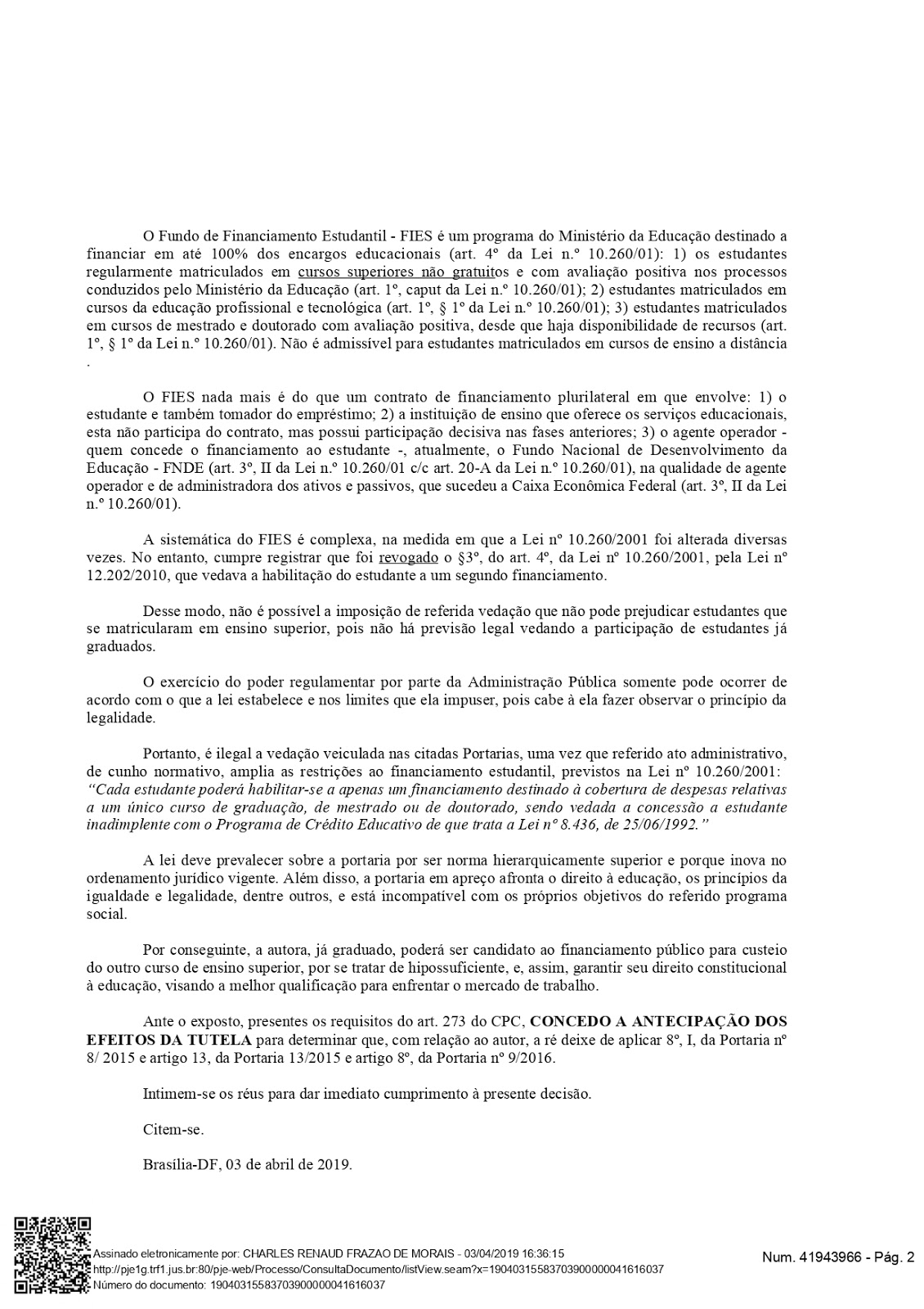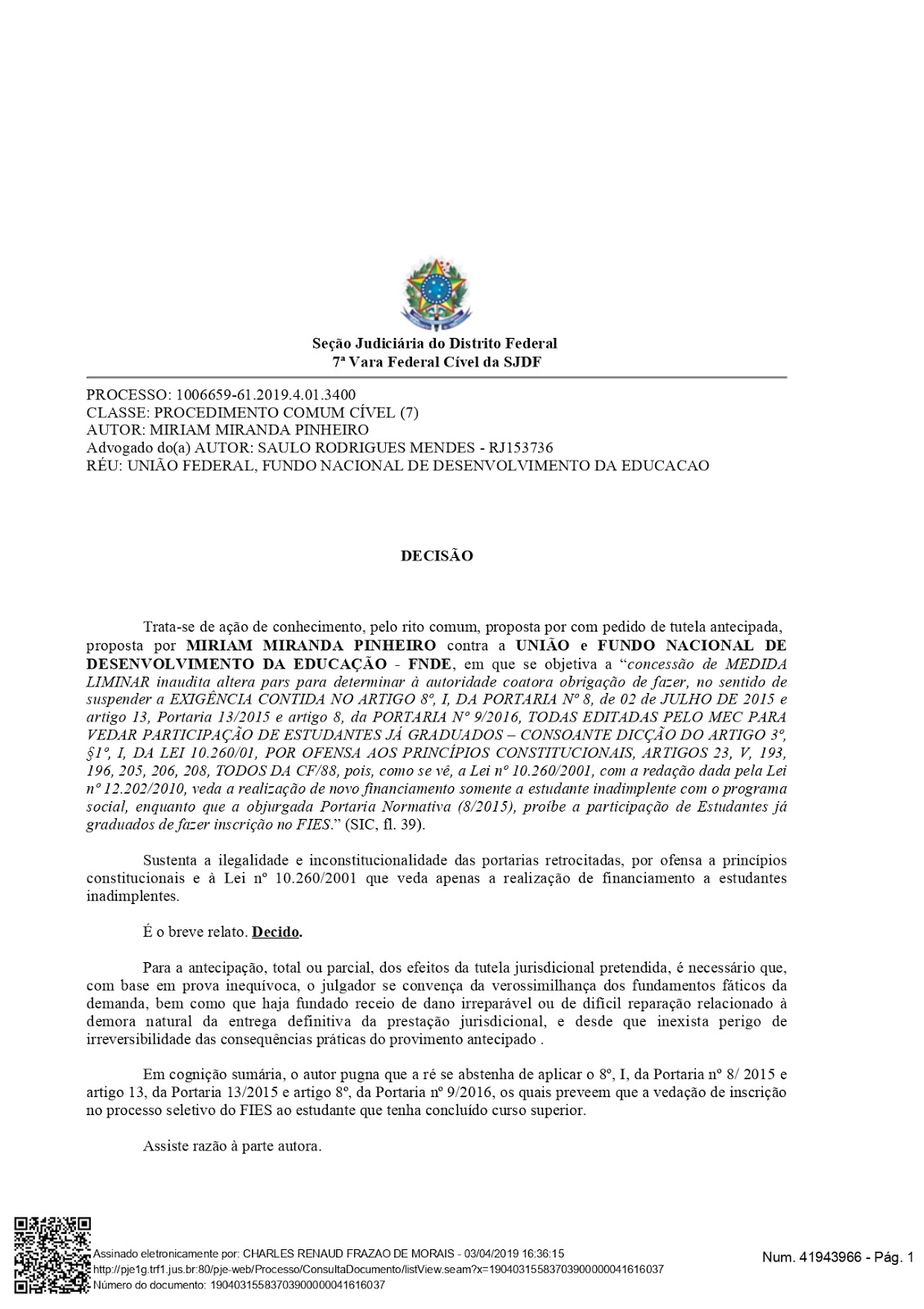 O Egrégio Tribunal Regional Federal da Primeira Região concedeu a tutela de urgência para que pretensa estudante ao curso de Medicina obtenha inscrição no FIES em que pese as malsinadas portarias para impedir ou dificultar o acesso de estudantes graduados ao programa de financiamento público do ensino superior. NO ponto, pois, confiram o entendimento sacramentado pelo Desembargador: